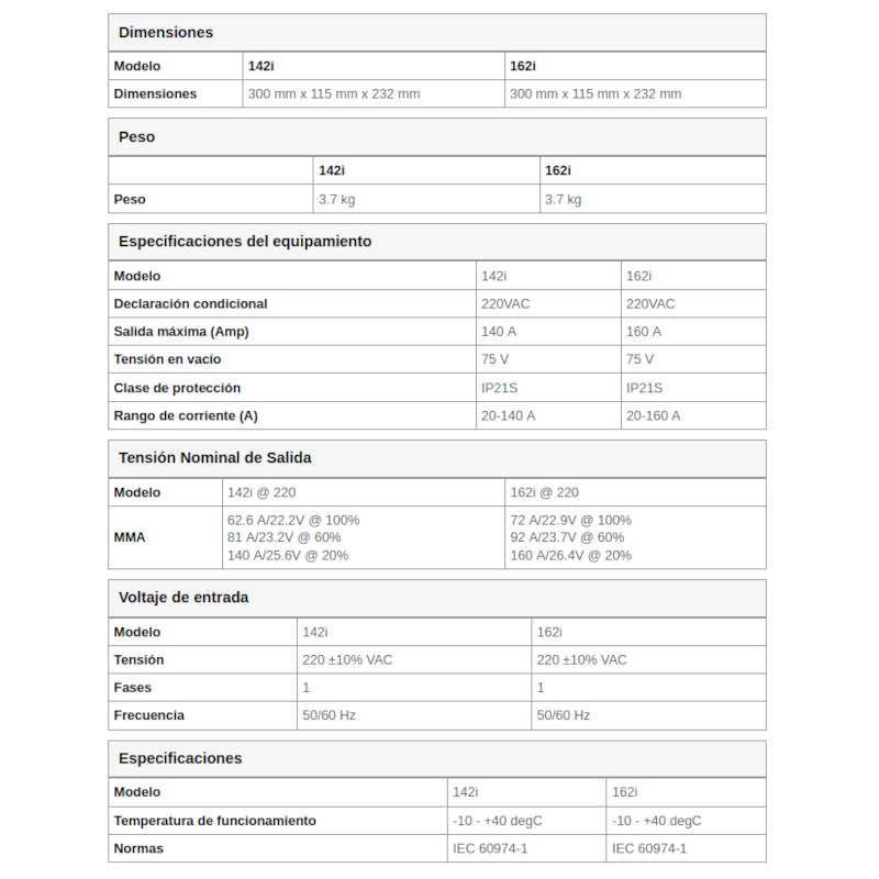 - Alto desempeño – Consoldabilidad impecable y fácil apertura del arco, el modelo 142i suelda electrodos de hasta 2.5 mm y el modelo 162i hasta 3.25 mm.