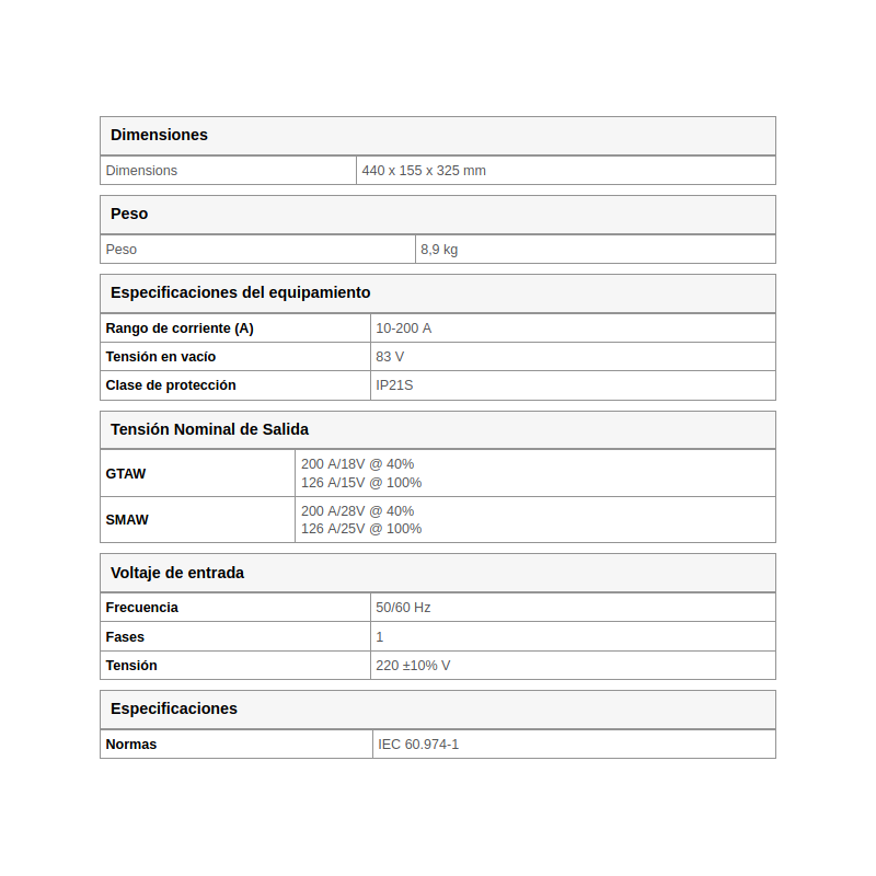 - Excelente soldabilidad con todo tipo de electrodos hasta 4,00 mm, incluyendo celulósicos E6010 / E6011 y E7018 con fácil apertura, arco estable y suave.